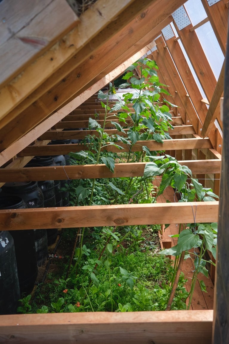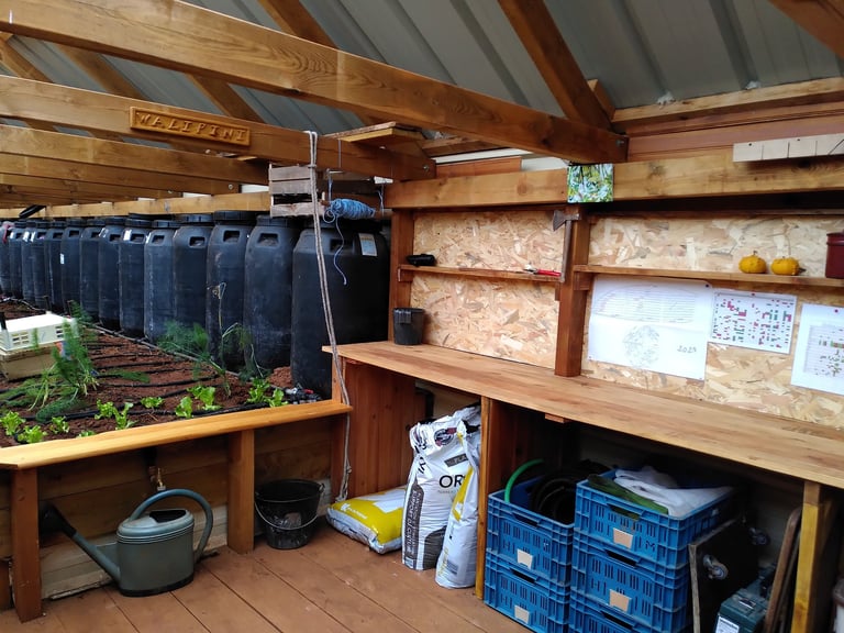 récupérer et utiliser l'eau de pluie (sans risque de gel) pour arroser et chauffer la serre (grâce à des cuves peintes en noir)